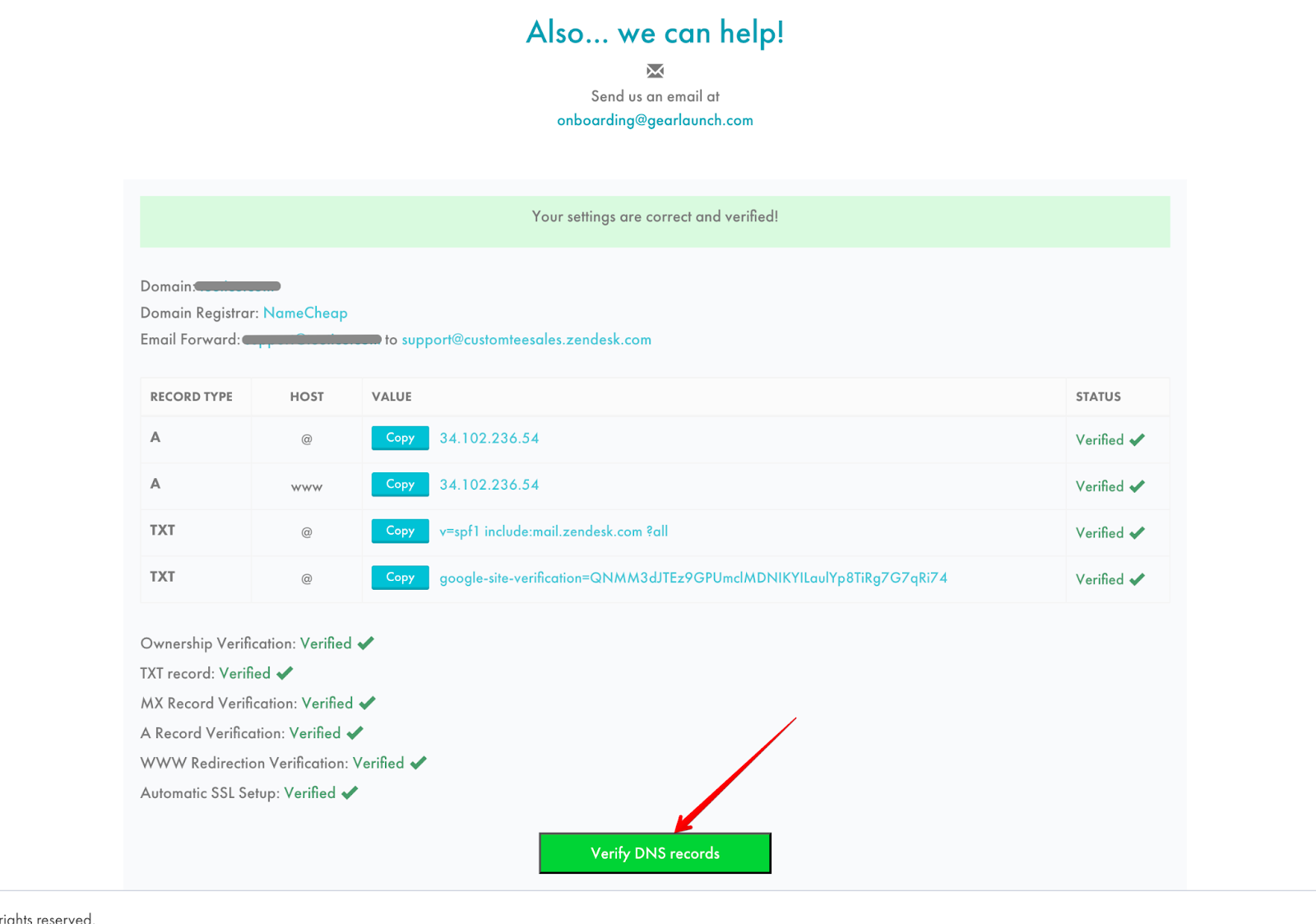 Once you have updated your DNS records on your domain registrar, go back to your GearLaunch dashboard and click the “Verify DNS records” button.
