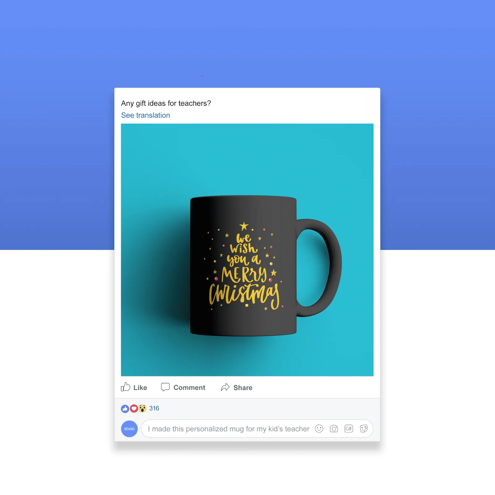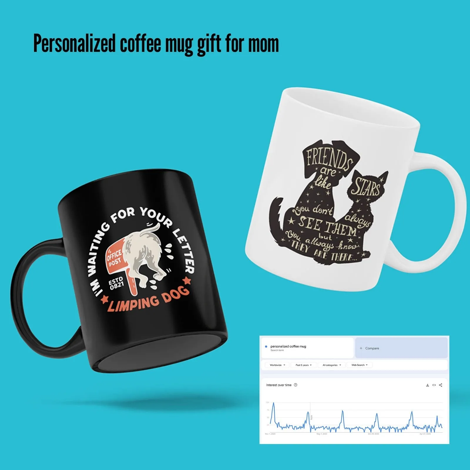Example: Photo of someone holding a custom mug with overlay text "Best Personalized Gifts Under $30"
